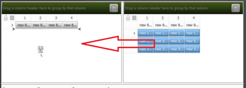 To check drag-drop feature please see DragDropFeature.exe example. It works like other drag providers - creates QMimeData on selected cells or rows and then paste it to the target. To get the target grid determines the location above the cell or the row by the position of the mouse. The place where there will be an attempt to drop the content, is highlighted by arrows. Then you release the mouse all data will be passed to QAbstractItemModel::dropMimeData() of the target.