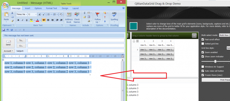 Please note that compared to the usual QtableView, QtitanDataGrid creates a MimeData that contains application/x-qabstractitemmodeldatalist, plain/text and data in HTML format. This makes it possible to drag the data to other non-Qt targets, for instance into Excel or the mail client.