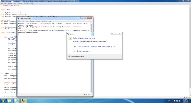 When running QtitanComponents demo examples eg PyQtitanComponents2020.2.1\examples\ribbon\DialogDemo\DialogDemo.py application crashes when it encounter any of DevMachines import statements.