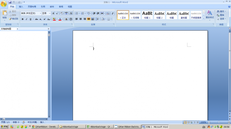 step1: run the ribbonbackstage demo in QT.(version: QT5.0.2, 32 bit, debug run).
