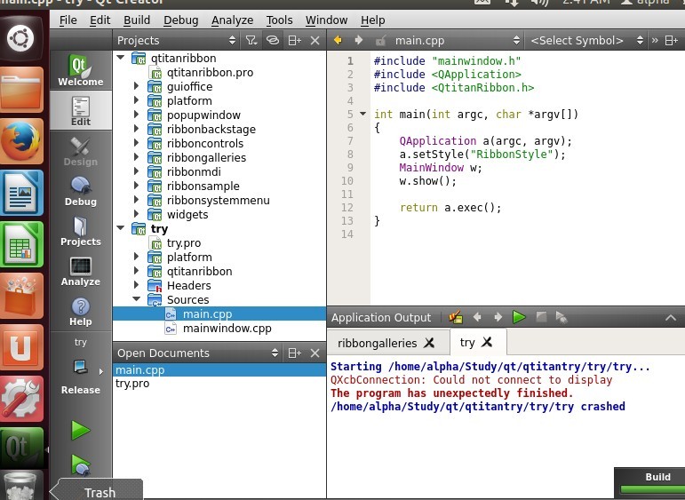 I also trid the instructions in Ubuntu. It didn't work. Open qtitanribbon.pro. Run qmake, No errors. Run Build All, No errors. Ctrl+R,then the error: